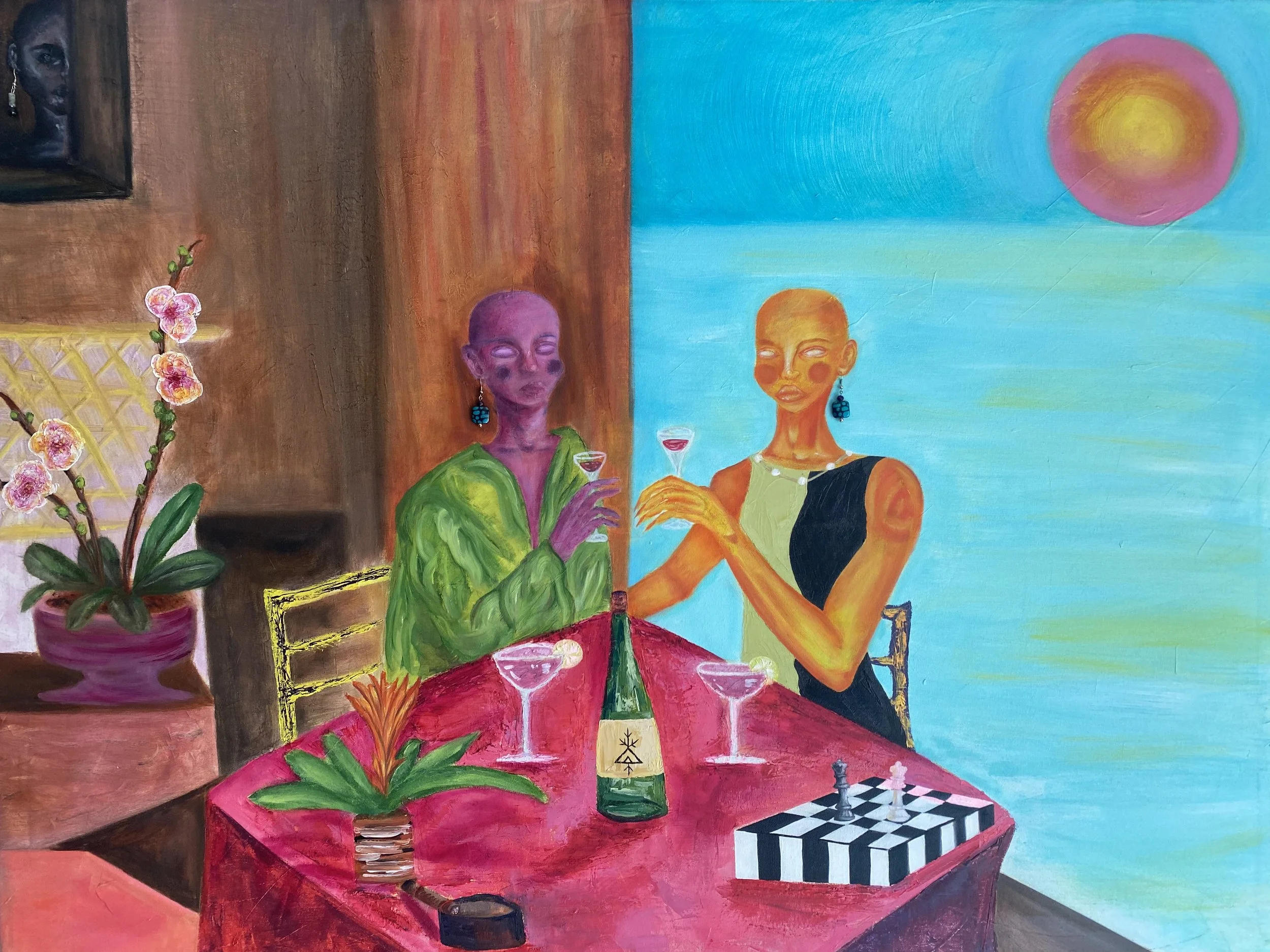 I chose a 20 year old photo of my grandma and her husband as a reference, but of course deciphered it in reflection of me, with her.. as adults.. enjoying a vacation together somewhere warm, with expensive drinks and outfits that we just bought, laughing and just being full of support and love.