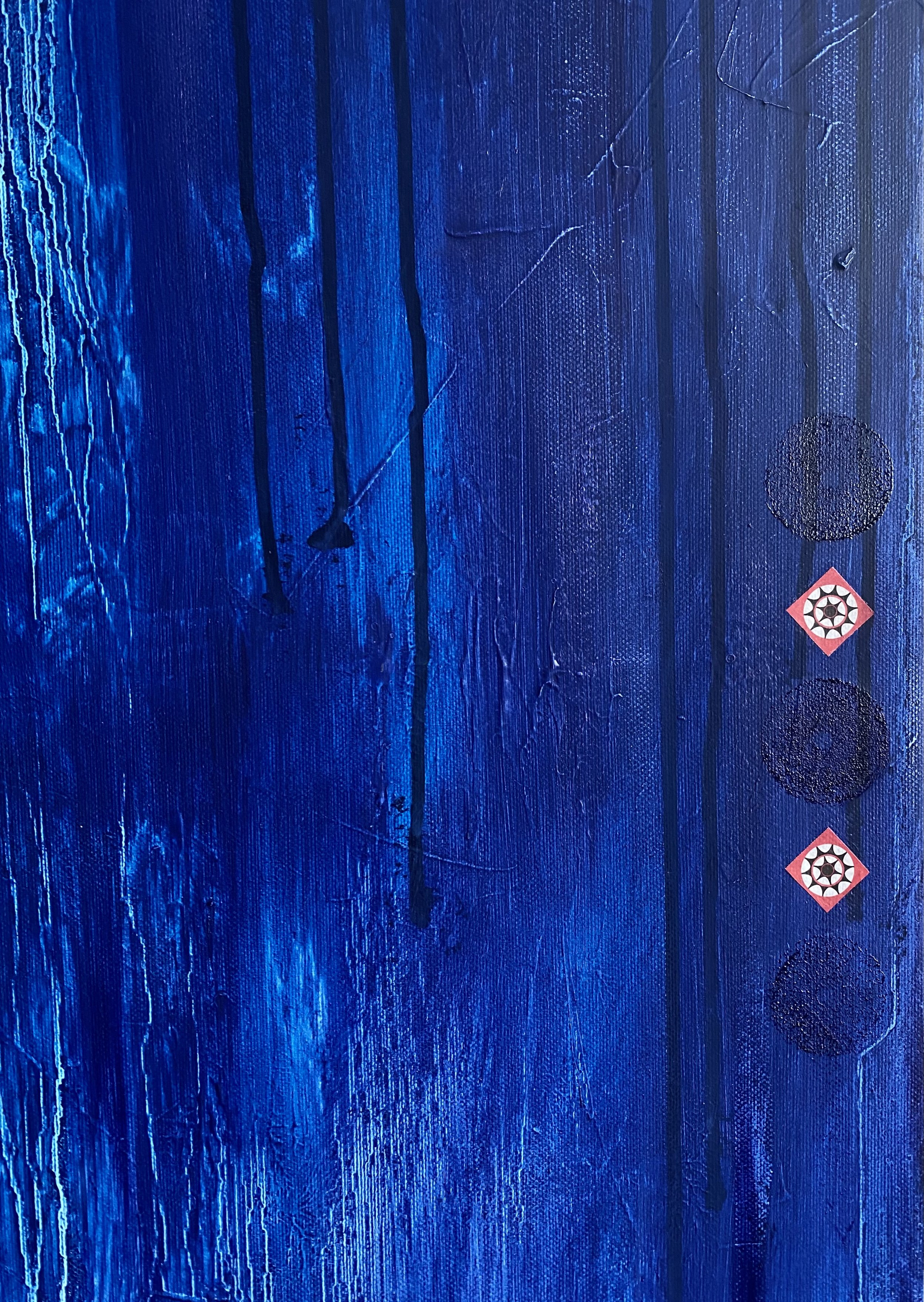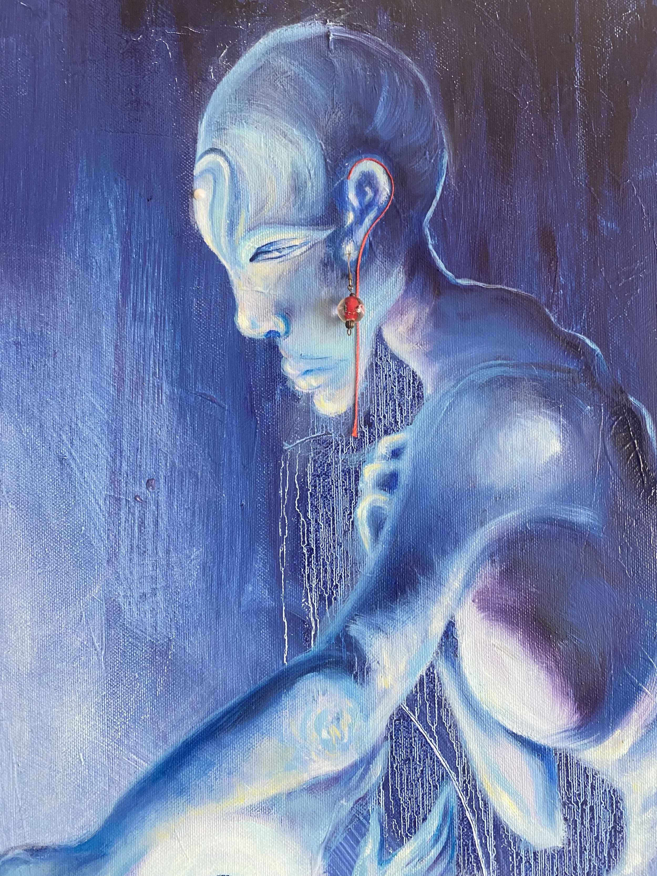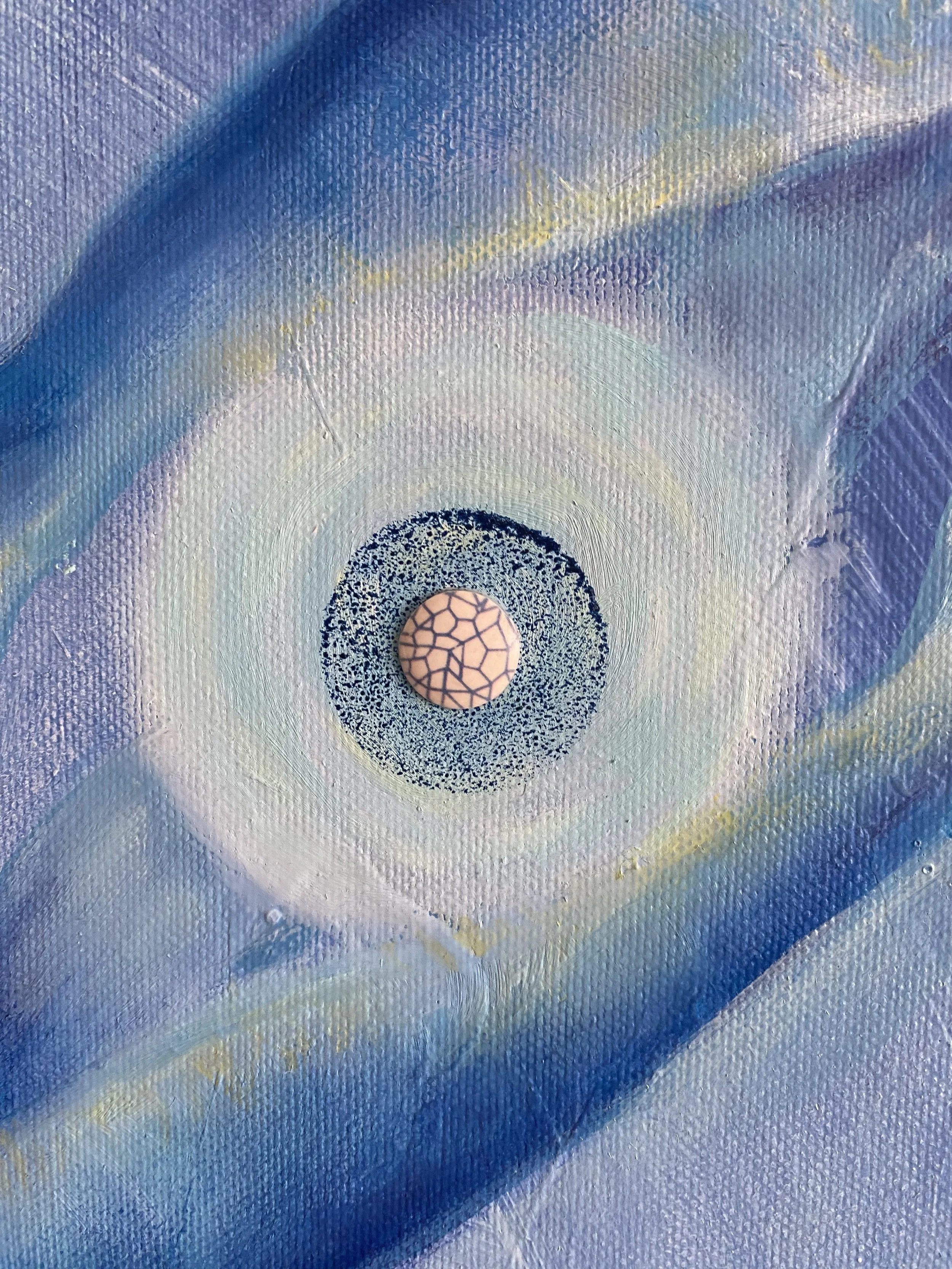 Oil, ink, upcycled paper, jewelry, yarn on stretched canvas