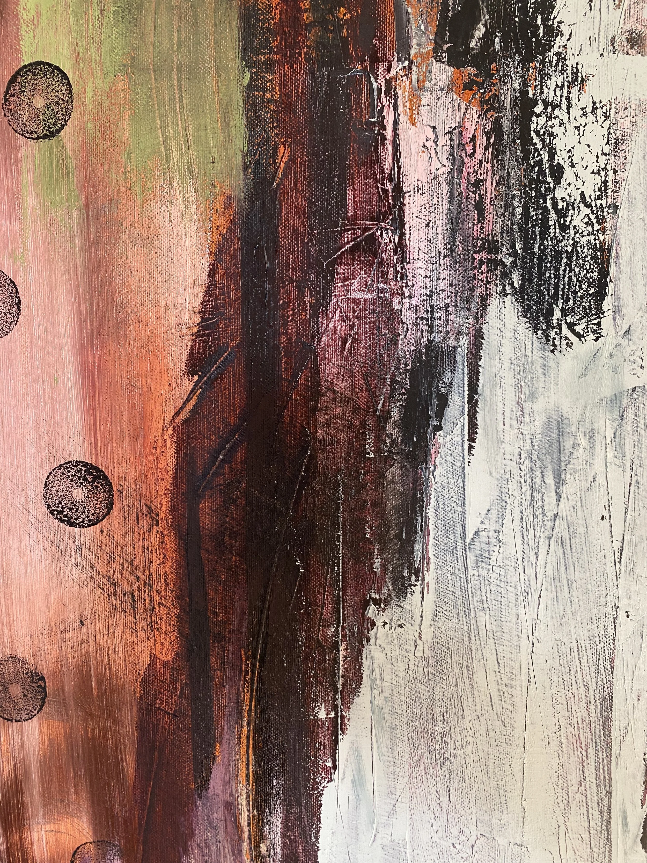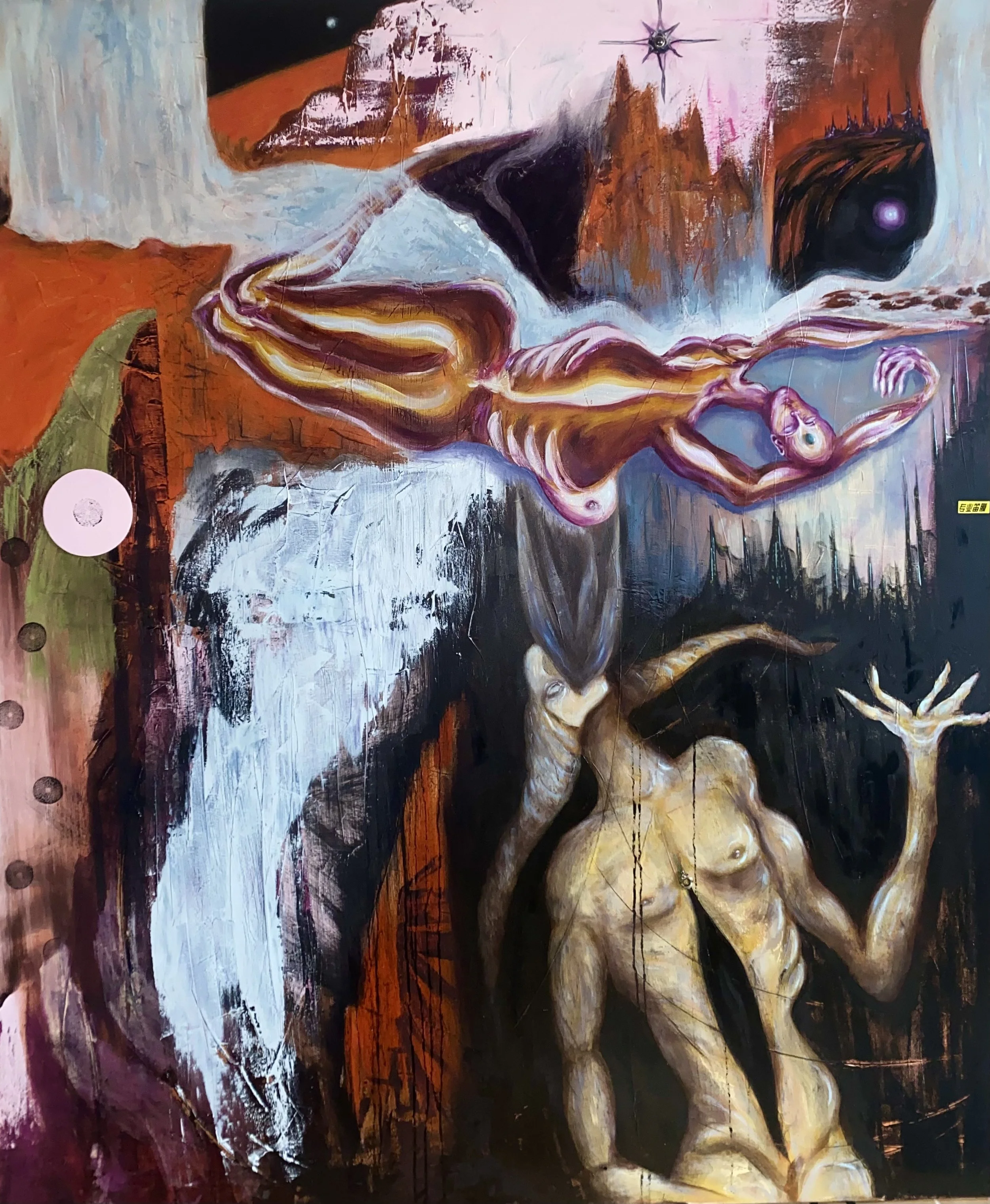 Oil, ink, jewelry, upcycled mixed media on stretched canvas