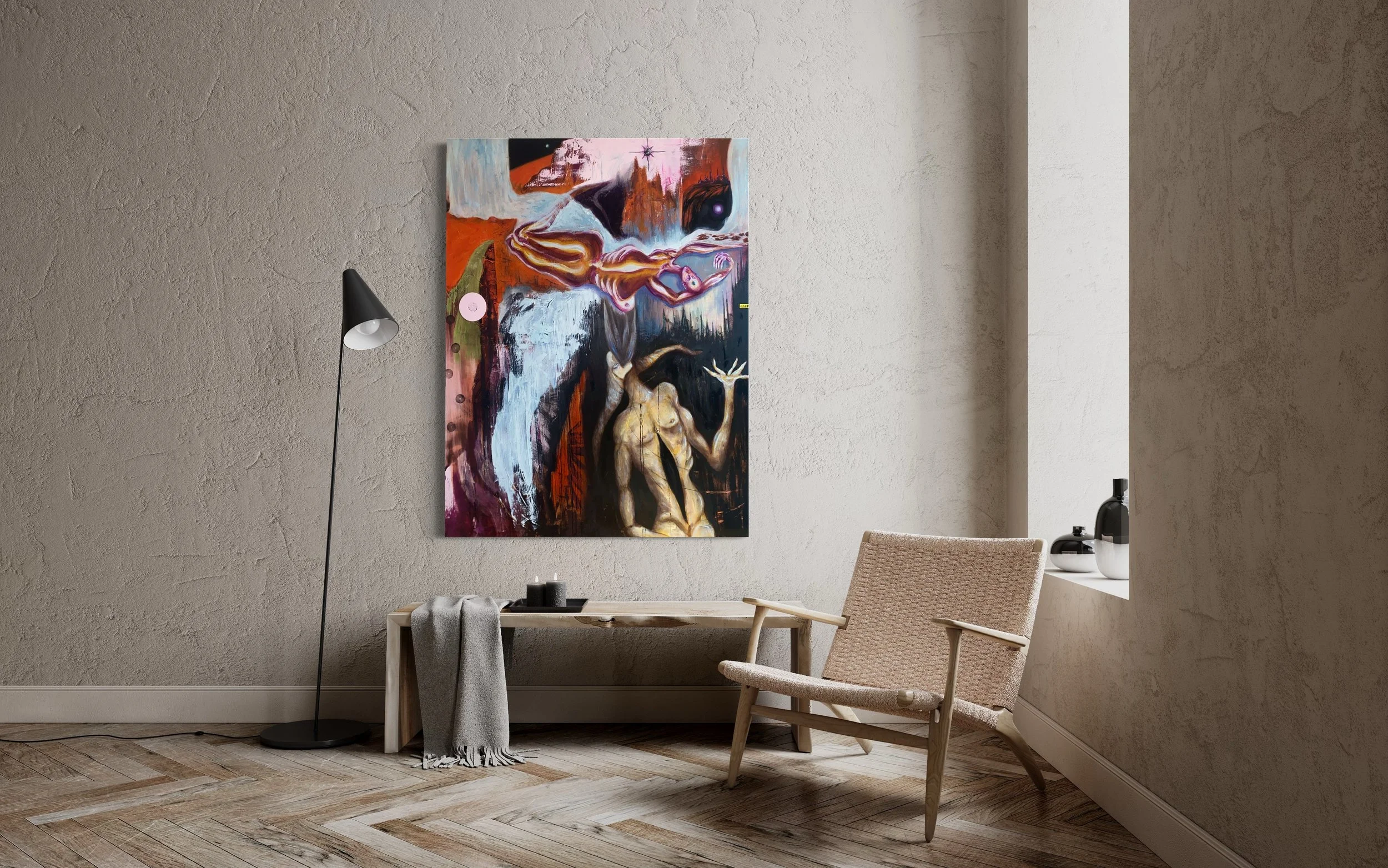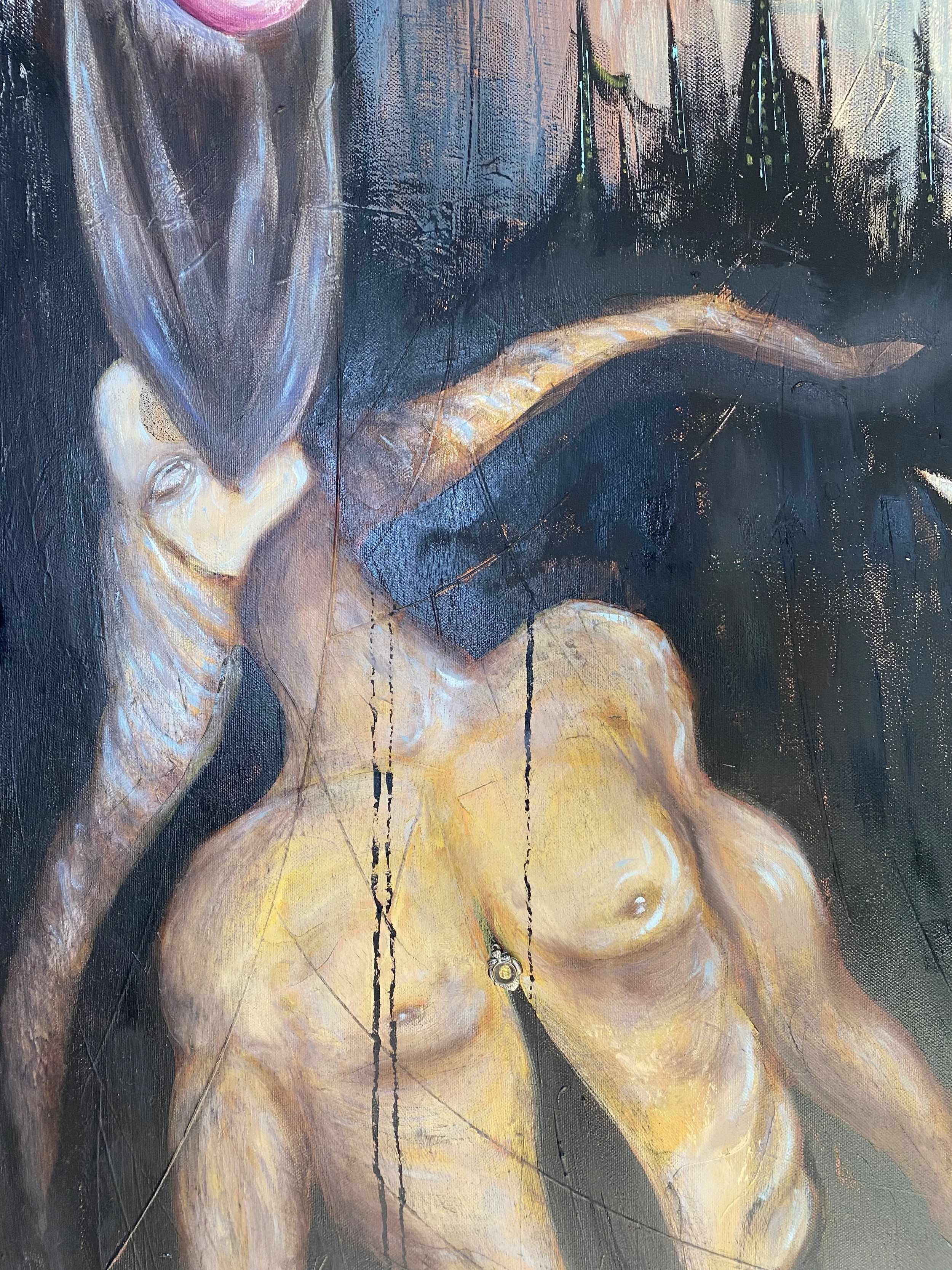 This painting for me, represents the feeling of gender dysphoria, and how you can turn that into euphoria by actively changing your mindset. The melting point of my shell means the exact moment I realized that If im supposed to wear a costume to not only survive, but thrive in this world, then I get to change that costume however and whenever I want. I am the darkness within me the same way I’m the light within me, and I can exist between, under, over, outside and within both and all aspects. There are no rules. You are free.