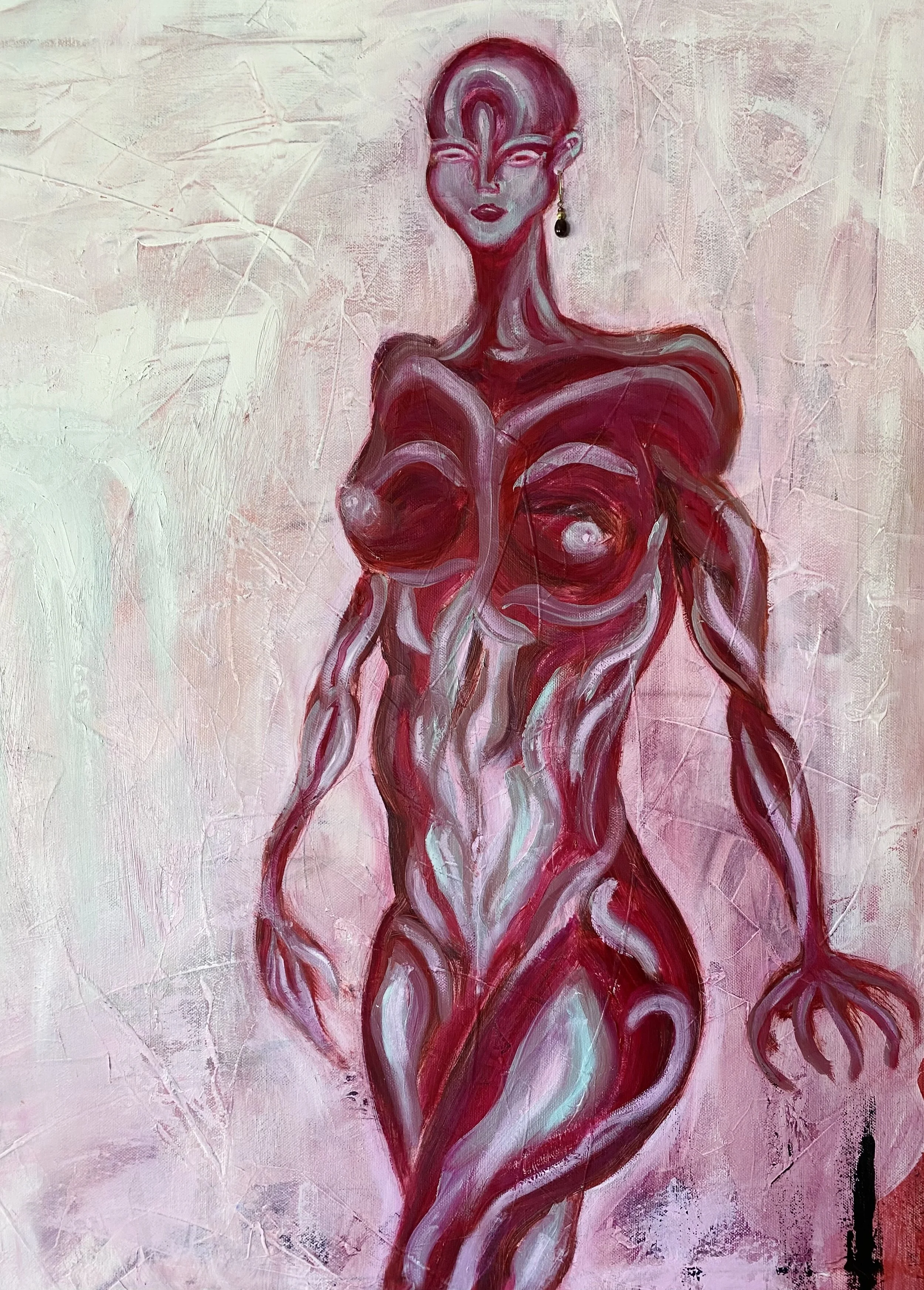 I painted the so-called self as this light blue creature looking up at the infinite universe which is the red-ish creature. You can kind of sense the fear in the self, when the universe just calmly approaches it with no prejudices.
